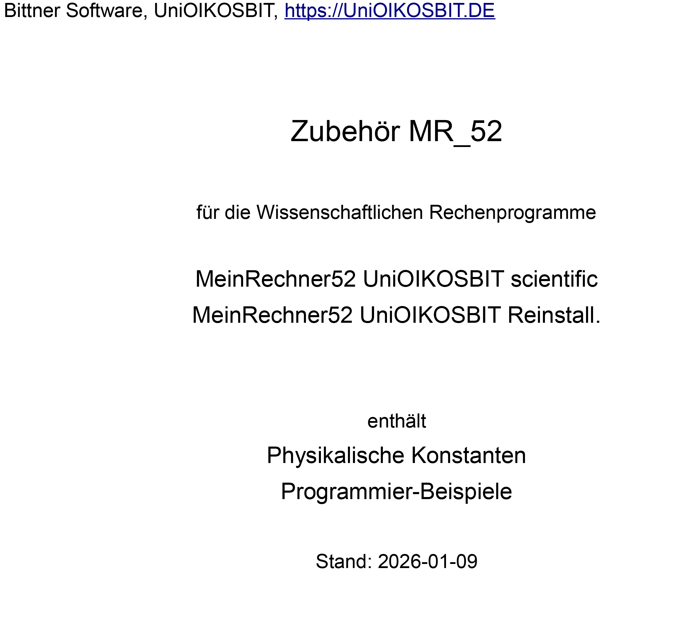 (2) Empfohlenes Zubehör zu MeinRechner52 enthält 27 Physikalische Konstanten sowie 111 Dateien mit Programmier-Beispielen und ist für 20,00 Euro incl. 19% MWSt. herunterladbar. (Warengruppe Download).